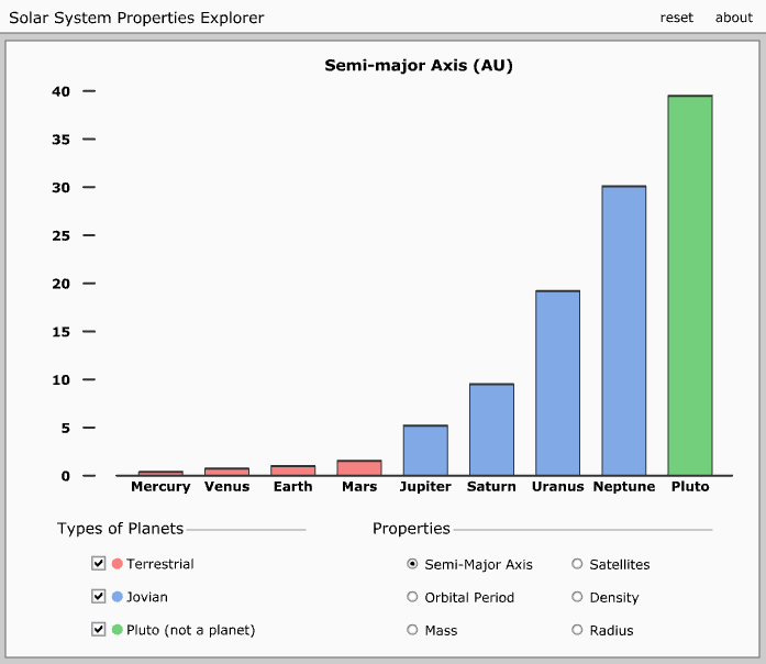 la masa, el periodo orbital, etc. de los planetas terrestres y jovianos, además de Plutón.